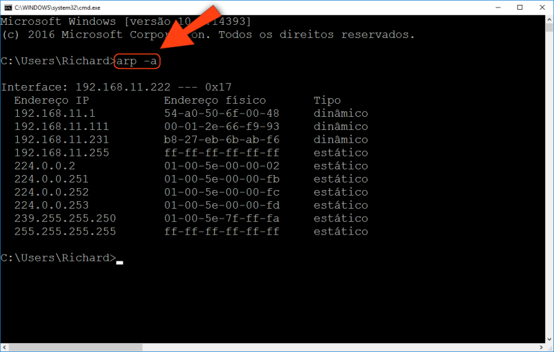 No Prompt de Comando digite o comando arp -a, sem as aspas e pressione ENTER. Uma lista de componentes conectados na sua rede deve aparecer.