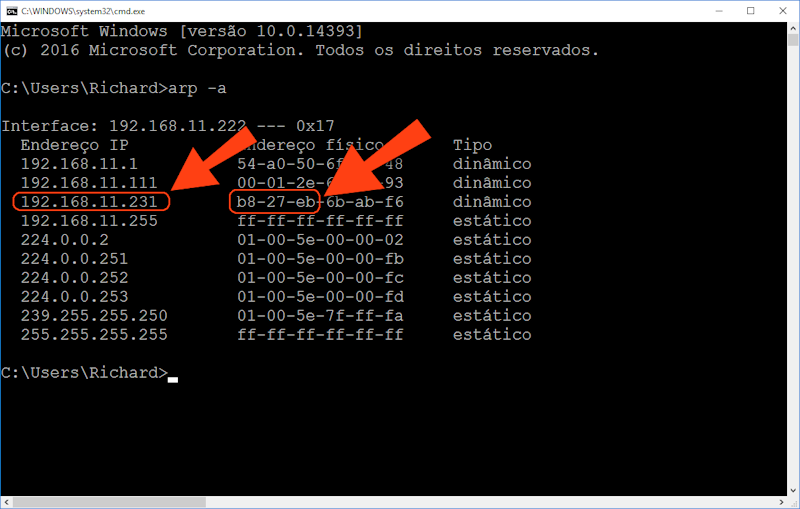 Localize no resultado do comando arp -a um endereço físico que comece com b8-27-eb e veja o respectivo Internet (endereço IP). Tome nota. É através desse endereço IP que você vai acessar sua Raspberry. Se você tiver mais de uma Raspberry Pi na mesma rede, elas também aparecerão na lista.
