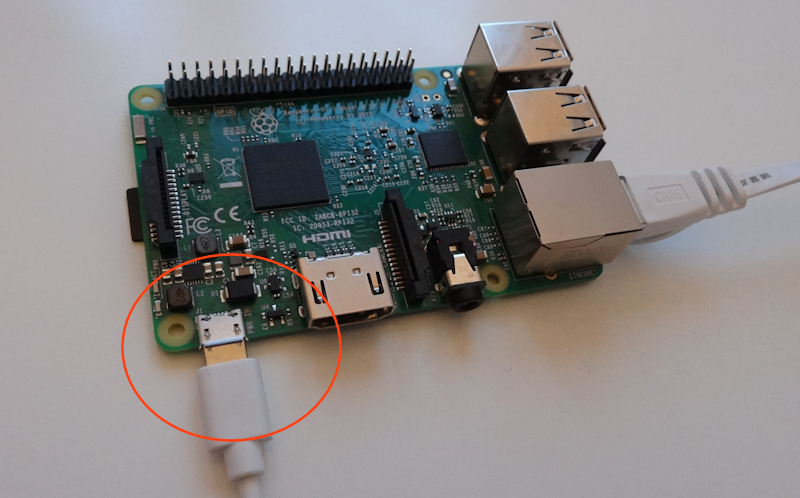 Nota: Se você não tiver um carregador USB, pode ligar a outra extremidade do cabo USB no seu micro, mas se você desligar ou resetar seu micro a Raspberry desliga. Quando a Raspberry é desligada subitamente existe o risco de perda de dados ou danos permanentes ao cartão microSD.