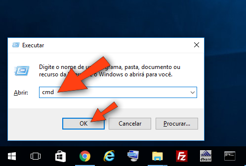 No Windows, abra o Prompt de Comando. Pra abrir o Prompt de Comando é só clicar no respectivo ícone no menu Iniciar ou pressionar simultaneamente as teclas WINDOWS + R, em seguida digitar cmd e pressionar a tecla ENTER (ou clique no botão OK).