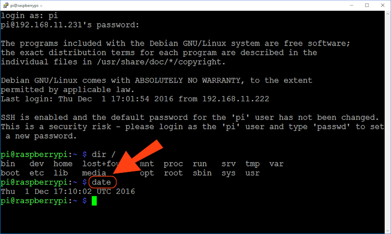 Agora digite date e pressione ENTER. A data e hora serão exibidas. Por enquanto não se preocupe se estiver errado, porque a próxima parte do tutorial mostrará como ajustar isso.
