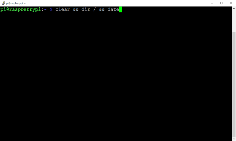 Vamos testar. Digite os três comandos juntos, separados por &&, dessa forma: clear && dir / && date e pressione ENTER.