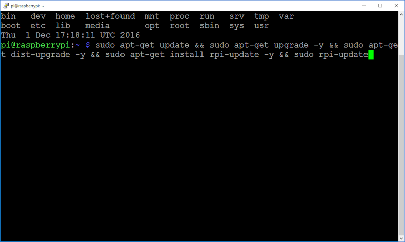 Nota: Após o digitar o comando sudo rpi-update pode ser necessário reiniciar o sistema. Se este for o caso, digite sudo reboot e pressione ENTER. Você também pode reiniciar o sistema manualmente digitando sudo reboot na janela do terminal. O Putty vai ser desconectado. Feche a janela do terminal e em seguida conecte-se novamente com o Putty.