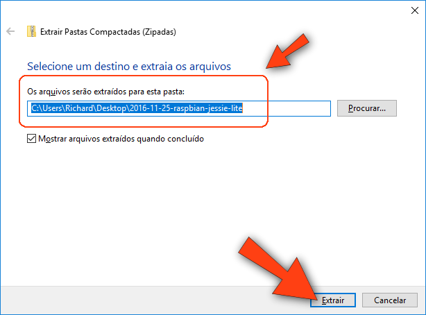 Nota: No nosso caso, o local é C:\Users\Richard\Desktop\2016-11-25-raspbian-jessie-lite mas o seu certamente será diferente.
