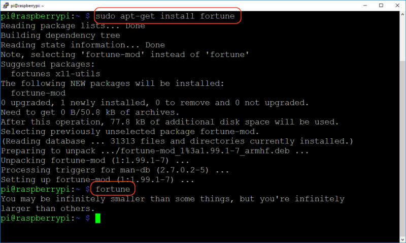 O FORTUNE é um programinha que funciona como um biscoito da sorte Chinês. Ele apresenta frases aleatórias. Pra instalar, digite na janela do terminal sudo apt-get install fortune -y e pressione ENTER.