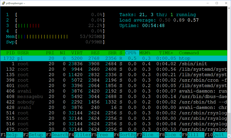 O HTOP é um programa que mostra em tempo real a utilização de memória e processador da sua Raspberry. É útil para identificar problemas, como por exemplo lentidão causada pelo uso excessivo de memória e/ou processador por algum programa inadequado ou mal configurado.