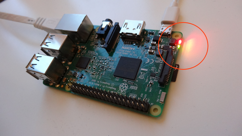 Assim que você conectar o cabo USB a Raspberry vai ligar. Fique de olho nela! O LED vermelho vai ficar aceso direto e o LED verde vai piscar por cerca de 1 minuto até apagar completamente. Se apenas o LED vermelho acender e o verde não piscar nunca, significa que o cartão microSD não foi preparado corretamente. Se isto acontecer, você vai ter que preparar o cartão microSD novamente.