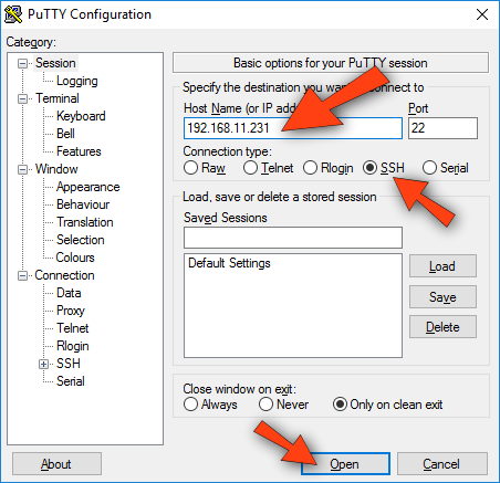 Na lacuna Host Name (or IP address) digite o endereço IP da sua Raspberry, certifique-se que a opção SSH está ativada e pressione ENTER ou clique no botão Open.