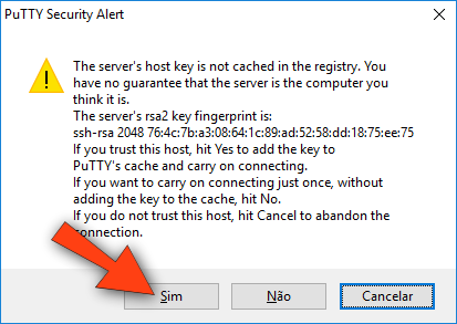Em seguida o Putty vai pedir você de segurança. Isso só acontece quando o micro que você está utilizando conecta com a Raspberry pela primeira vez. Clique no botão Sim.