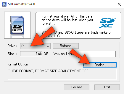 Selecione o Drive onde o microSD está inserido e clique em Option.