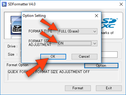 Ajuste as opções para FULL (Erase) e ON e clique em OK.