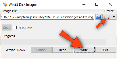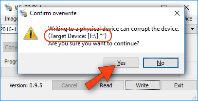 Em Device selecione o Drive correspondente ao microSD (no nosso caso "F:") e clique em Write. IMPORTANTE! Certifique-se que o Drive selecionado corresponde ao microSD. Se você selecionar o Drive errado e prosseguir com os passos abaixo, pode apagar algum disco ou outra memória por engano, inclusive perdendo todos os dados do seu computador.